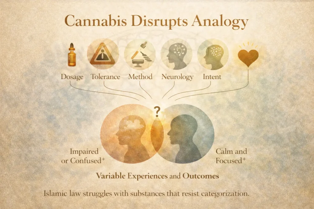 Islamic law struggles with substances that resist categorization because the law prefers predictable outcomes. Cannabis does not reliably produce the same state in every user, which makes blanket rulings difficult to justify on purely functional grounds.